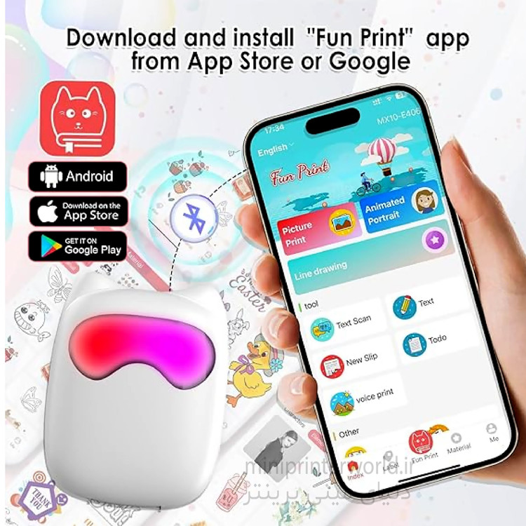 ☞ اتصال آسان: از اتصال آسان BT بین چاپگر قابل حمل و تلفن هوشمند خود لذت ببرید. می توان آن را به سادگی با ایجاد یک اتصال از طریق رابط برنامه تعیین شده به طور یکپارچه استفاده کرد. لطفاً راهنمای کاربر را دنبال کنید تا برنامه مرتبط (چاپ سرگرم کننده) را از طریق APP Store (سیستم iOS) یا Play (سیستم اندروید) دانلود کنید.