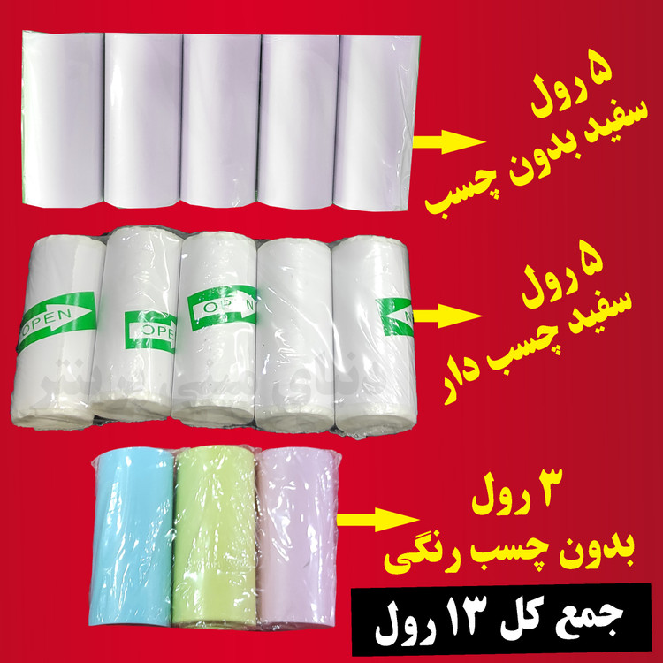 رول کاغذ مینی پرینتر بسته میکس ساده سفید و چسبدار سفید و بدون چسب رنگی