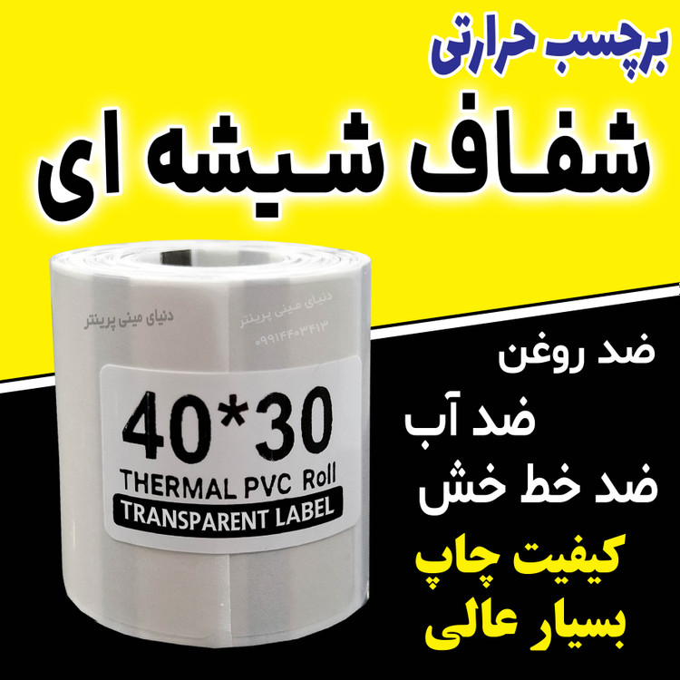 لیبل حرارتی شفاف شیشه ای اندازه 30*40 میلیمتر جنس PVC پاره نشو ضدآب ، چاپ بسیار شفاف و عالی