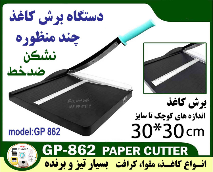 تیغه تیز فولاد منگنز 65 است که می تواند به راحتی از میان پشته های کاغذ برش دهد. برش کاغذ می تواند کاغذ را به طول 305 میلی متر برش دهد و می تواند تا 16 ورق کاغذ کپی را همزمان برش دهد.