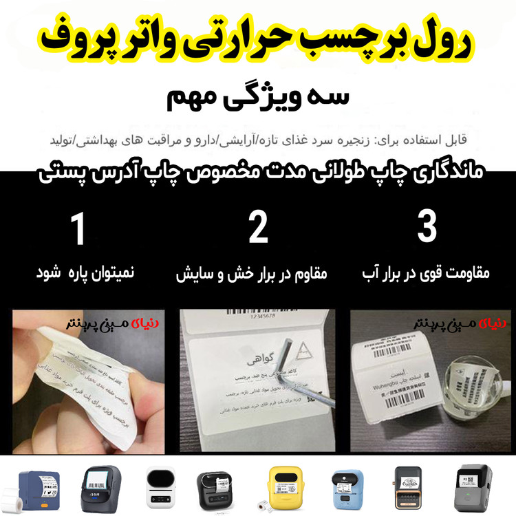 2- ضد آب ( تست چاپ که مدت 24 ساعت لیبل چاپ شده در آب بماند هیچ تغیری نه کمرنگ پاک نمی شود )