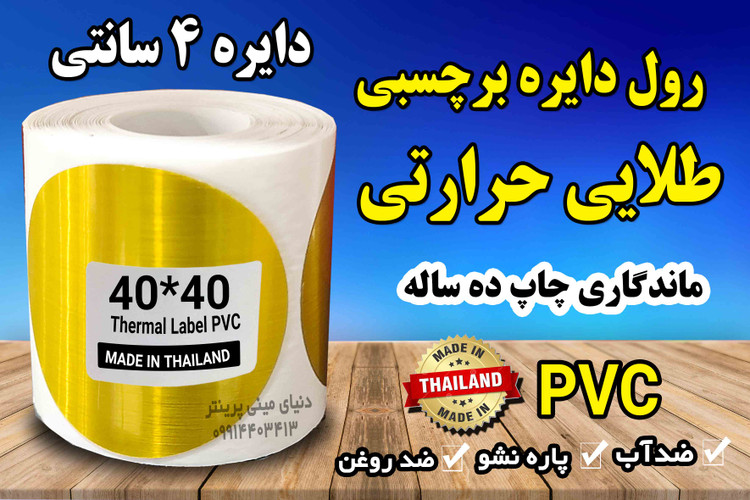 برچسب دایره طلایی حرارتی PVC اندازه 40 میلیمتر| ضد آب ماندگاری چاپ ۱۰ ساله | سازگار با تمام لیبل زنها