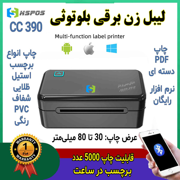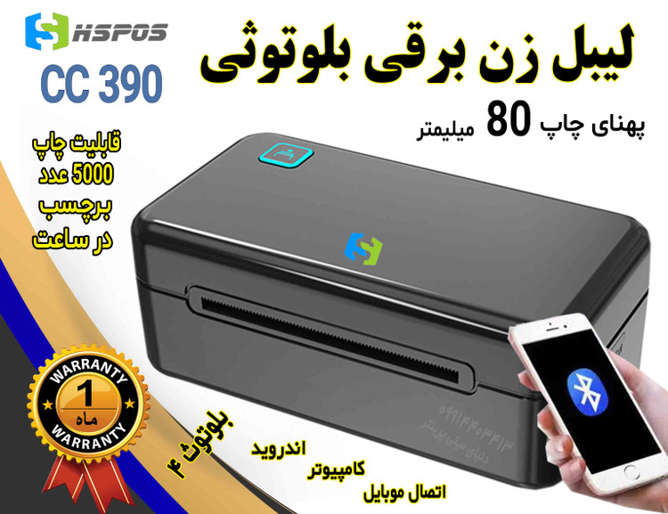 🔥 لیبل زن برقی بلوتوثی HSPOS CC390 | چاپ سریع بارکد و لیبل تا عرض 80 میلیمتر