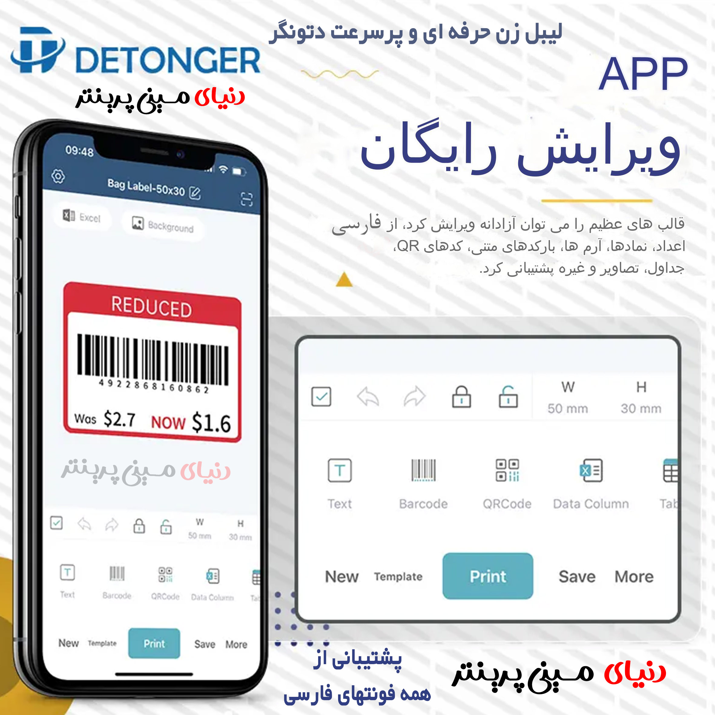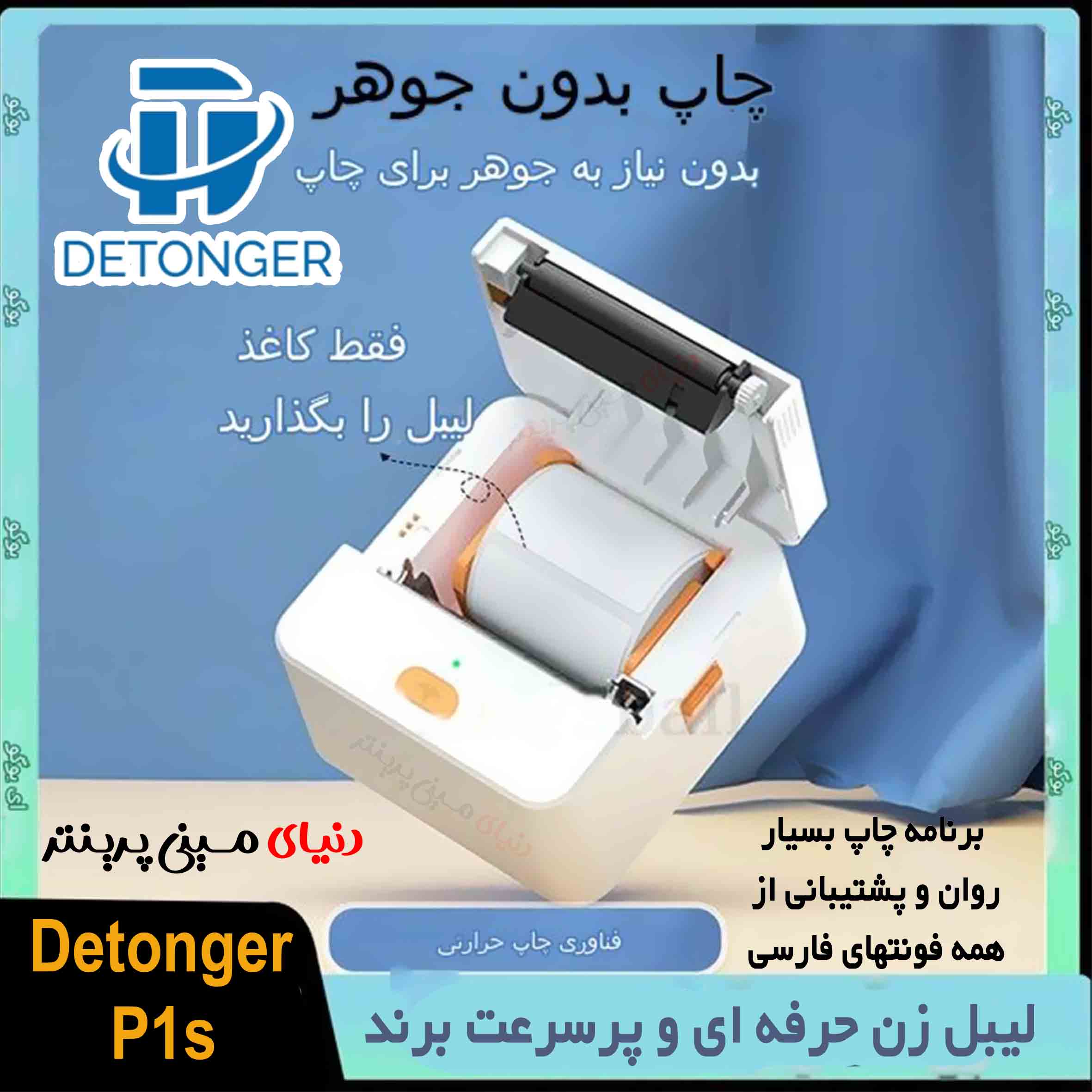پرینتر لیبل زن حرفه ای برند Detonger چون نماینده فروش محصولات Detonger و وارد کننده مسقیم از کارخانه هستم با قیمتی بسیار مناسب و رقابتی گذاشتم #برندی بسیار معتبر و جهانی که لیبل زن صنعتی تولید میکنه # ☢️هر آنچه که موبایل دارین رو بصورت لیبل و کاغذ رول چاپ میکنه بدون نیاز به جوهر البته بصورت سیاه سفید ☢️ 📦ابزاری بسیار عالی برای آنلاین شاپ ها که آدرس فرستنده و گیرنده رو براحتی با اسکرین شات چاپ کنه 📦 فروشگاهای مختلف مثل سوپر مارکت ها و غیره که لیبل بارکد و قیمت روی اجناس بزنند 👍مزیت لیبل زن Detonger مدل P 1. با بقیه مینی پرینتر ها کوچک 1-کیفیت چاپ بسیار پررنگتر 2-باطری 1500 میلی آمپر 3-سنسور تشخیص فاصله لیبل ها در رول 4-برنامه چاپش Weidaبسیار روان و راحت 5-کیفیت رزولوشن 203 واقعی چاپ 6-برند شرکت detonger معتبر و محصولات با کیفیت ارائه میدهد و پرینترهای صنعتی تولید میکنه 7-پورت usb type ç 8- این دستگاه مخصوص چاپ لیبل(برچسب) تولید شده است 9-قابلیت اتصال ازطریق پورت usb به کامپیوتر ✅سایز های مختلف لیبل چاپ میکنه در اندازهای 40*50 میلی متر. 25*35 میلیمتر 25*50 میلیمتر. 15*45. میلیمتر. 30*45.میلیمتر و 25*50 میلیمتر موجود هست 🔥یکی از مزیتهای اصلی این پرینتر پشتیبانی از همه فونتهای فارسی هست که میتوان در برنامه چاپش به راحتی اضافه و استفاده کنید 🔥